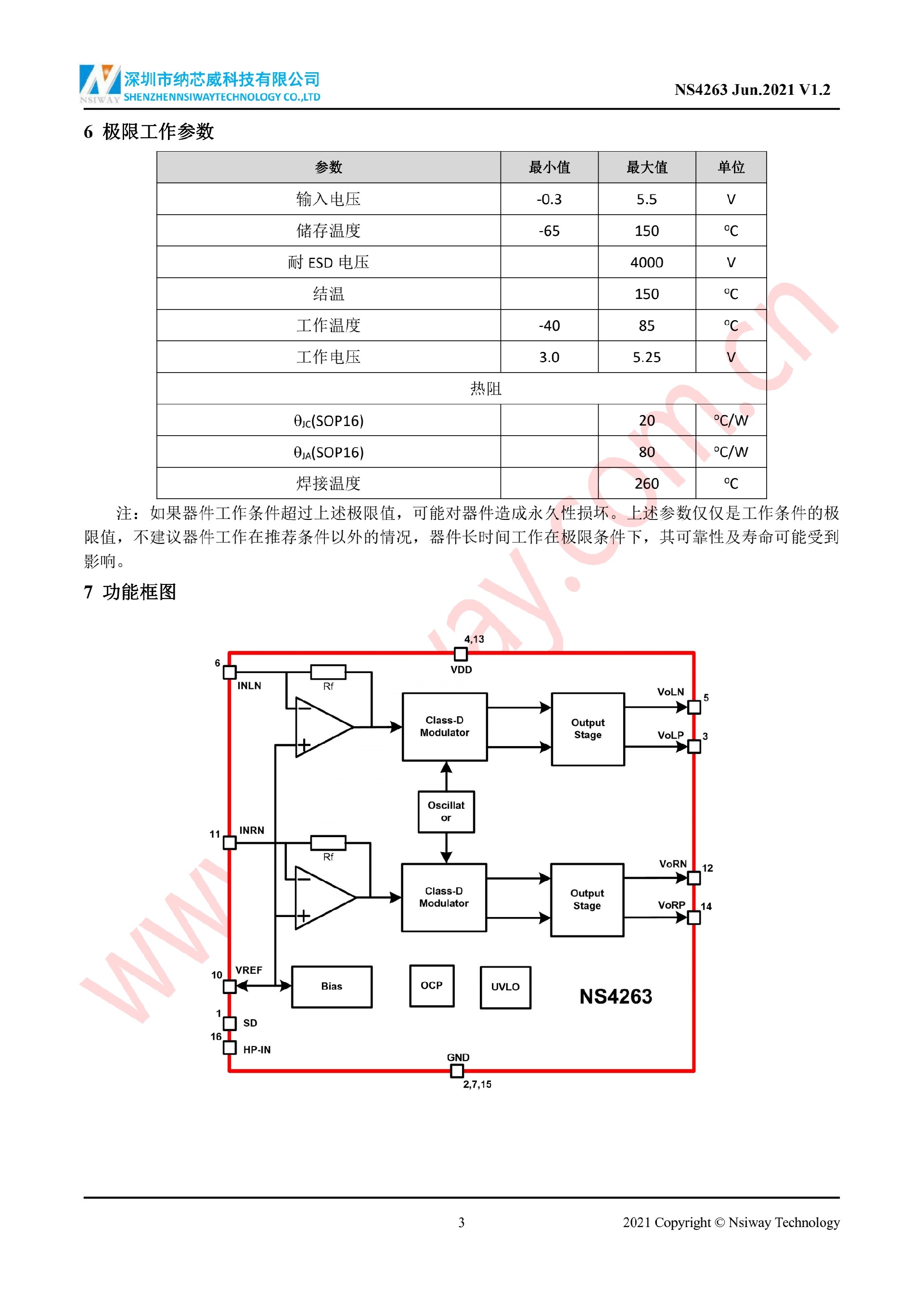 NS4263 3Wx2 双声道AB/D类双模音频功率放大器附加耳机模式(SOP-16)